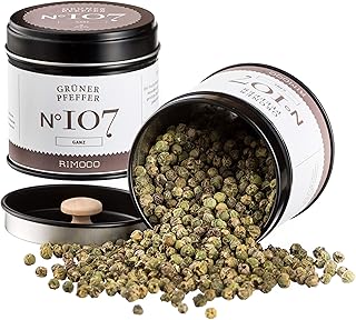 Rimoco N°107 Bio Grüner Pfeffer - getrocknet und ganze Pfefferkörner, eukalyptusartig, scharf, kräuterig, zitronig | Bio Anbau (DE-ÖKO-007) | 40g in eleganter Gewürzdose mit Aromadeckel