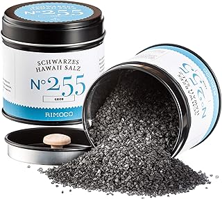Rimoco N°255 Schwarzes Hawaii Salz grobkörnig - Hawaiian Black Lava Sea Salt, mittelgrobe Salzkristalle veredelt mit hochreiner medizinischer Aktivkohle | 130g in eleganter Gewürzdose mit Aromadeckel