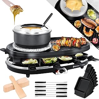 Großes Raclette Grill Set für bis zu 8 Personen - 3in1 Grill, Raclette Platte und Fondue mit Pfännchen und Holzspachtel - 1100 Watt starker Elektrogrill mit regulierbarem Thermostat