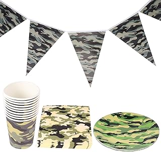 Tomaibaby 41-teiliges Partygeschirr-Set mit Camouflage-Muster, Geburtstagsparty-Zubehör, Einweg-Servietten, Pappbecher, Pappteller, Banner, Papiertücher für Geburtstagsparty-Dekoration