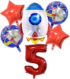 DIWULI, großes Raketen Weltraum Luftballon Set, XL Zahlen-Ballon Zahl 5 rot, Happy Birthday Folien-Ballons 5. Kinder-Geburtstag Junge, Motto-Party, Dekoration, Raumschiff, Astronaut, Sterne, Planet