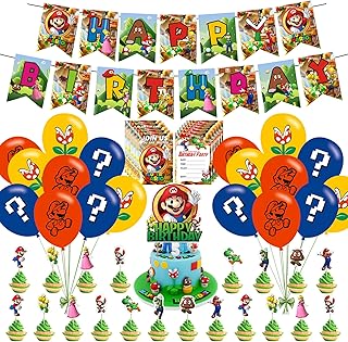 Super Mario Geburtstag Dekoration Set Mario Bros Geburtstagsdeko Junge,Geburtstag Luftballon Happy Birthday Banner,Einladungskarte ,Kuchendeckel Cake Topper für Babyshower Kinder Baby Junge Party