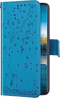 Uposao Kompatibel mit Huawei Y5 2019 Hülle Schutzhülle Lederhülle Kirschblüte Blumen Katze Muster Handyhülle Leder Tasche Klapphülle Wallet Flip Case Magnet Ständer Kartenfächer,Blau